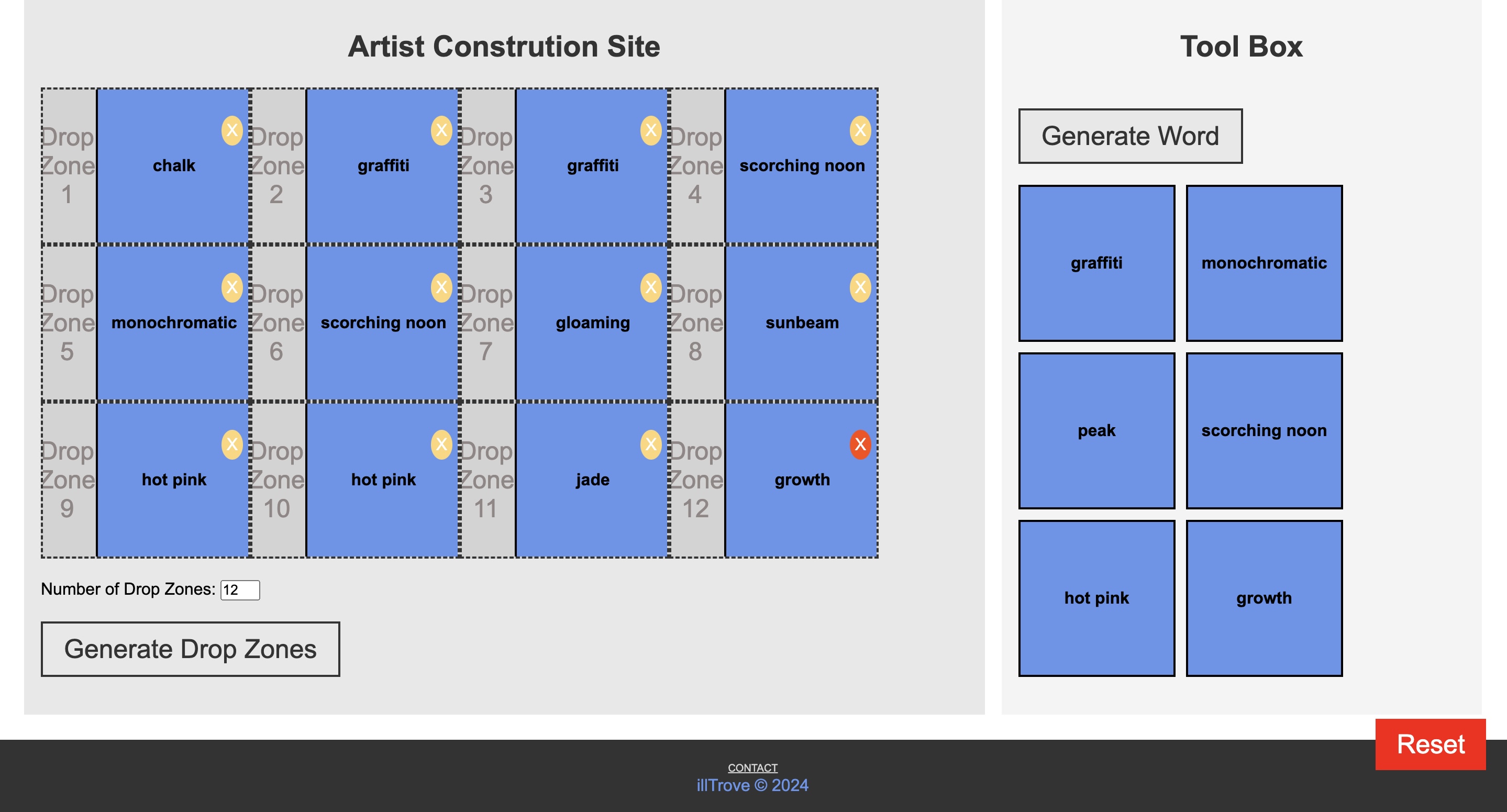 You can drag and drop your given words into different drop zones. Users can choose if they want to include a word from every grouping or use the same word more than once. To remove a drop zone, simply click the "X" button on the top right corner of the drop zone.