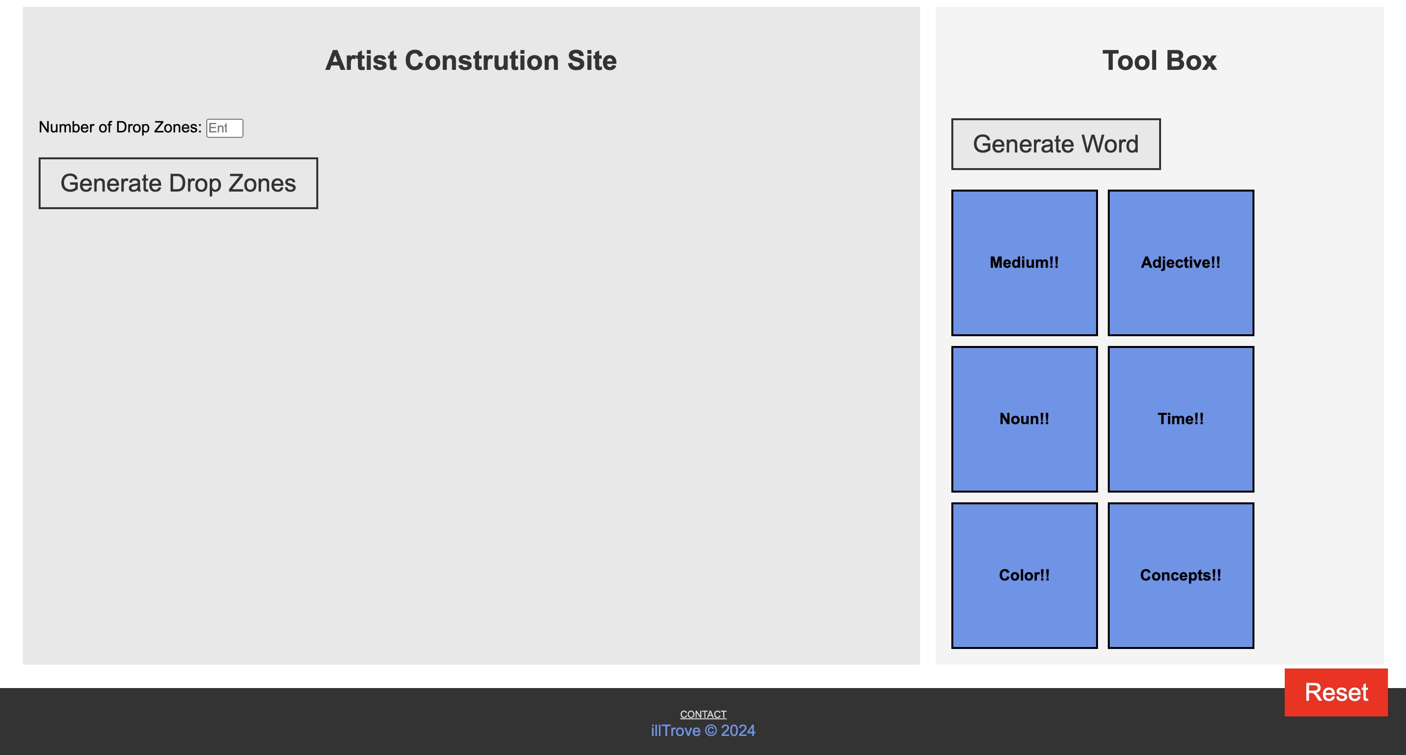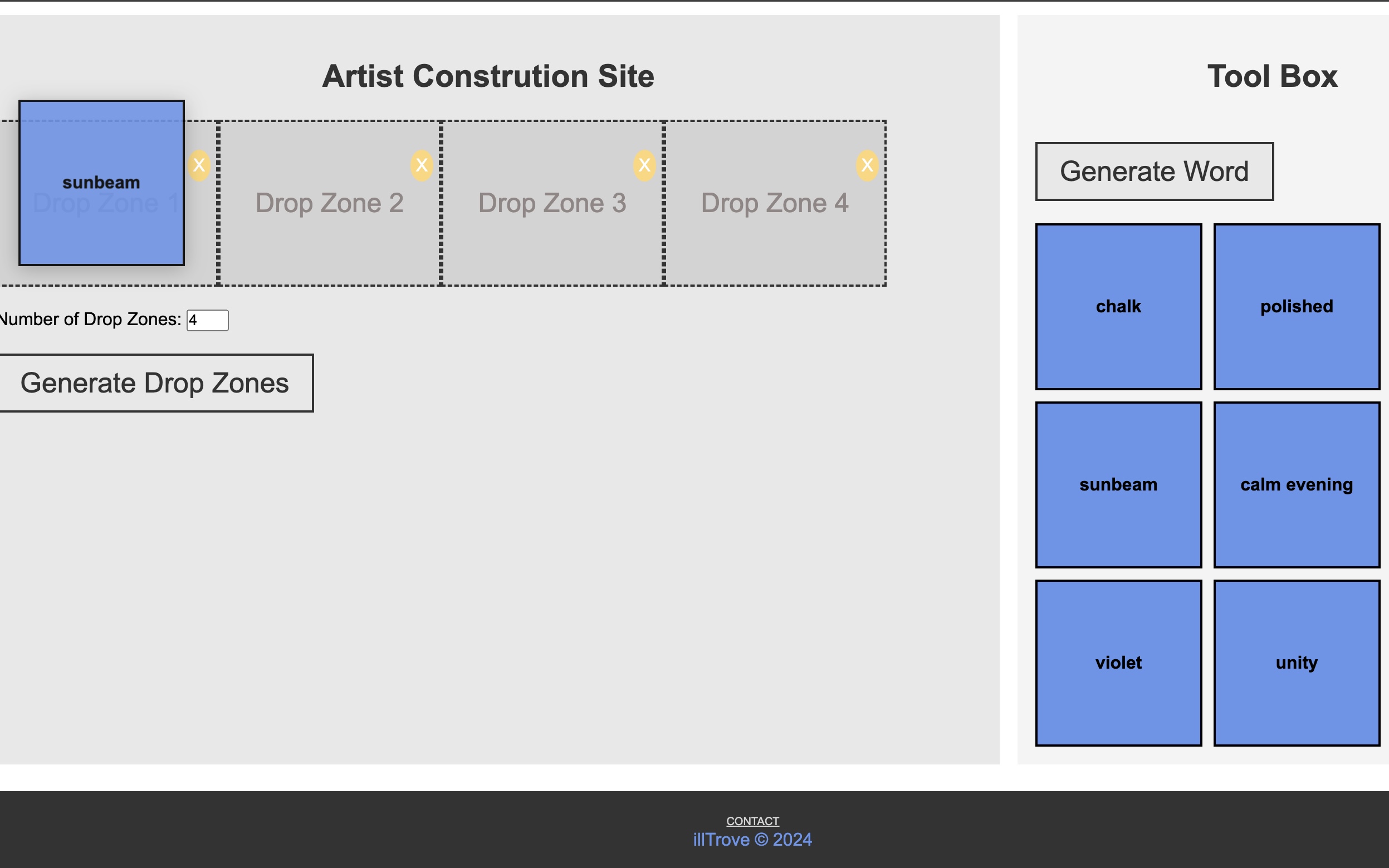 You can add up to twleve new drop zones by clicking the "Generate Drop Zones" button. Each drop zone allows you to place the draggable boxes into it. This helps you organize the selections visually. (Works best on laptop devices, but can be used on moblie).